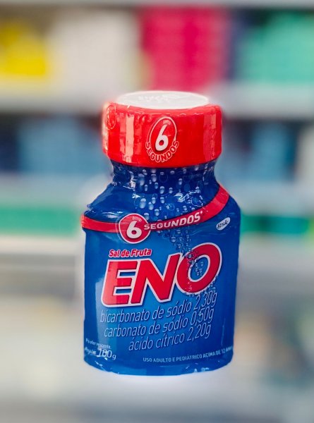 Os componentes do Sal de Fruta Eno, quando dissolvidos em água, reagem entre si, produzindo um sal de efeito antiácido, capaz de iniciar a redução da acidez do estômago em 6 segundos.