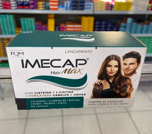 Imecap® Hair Max tem fórmula exclusiva, com colágeno hidrolisado e dois importantes aminoácidos, Cisteína e a L-cistina, que agem na produção da queratina do cabelo, proporcionando mais força, brilho, resistência e diminuindo a queda capilar.* Sua formulação possui zinco, que contribui para a manutenção do cabelo, da pele e das unhas. Indicado para homens quanto mulheres.
